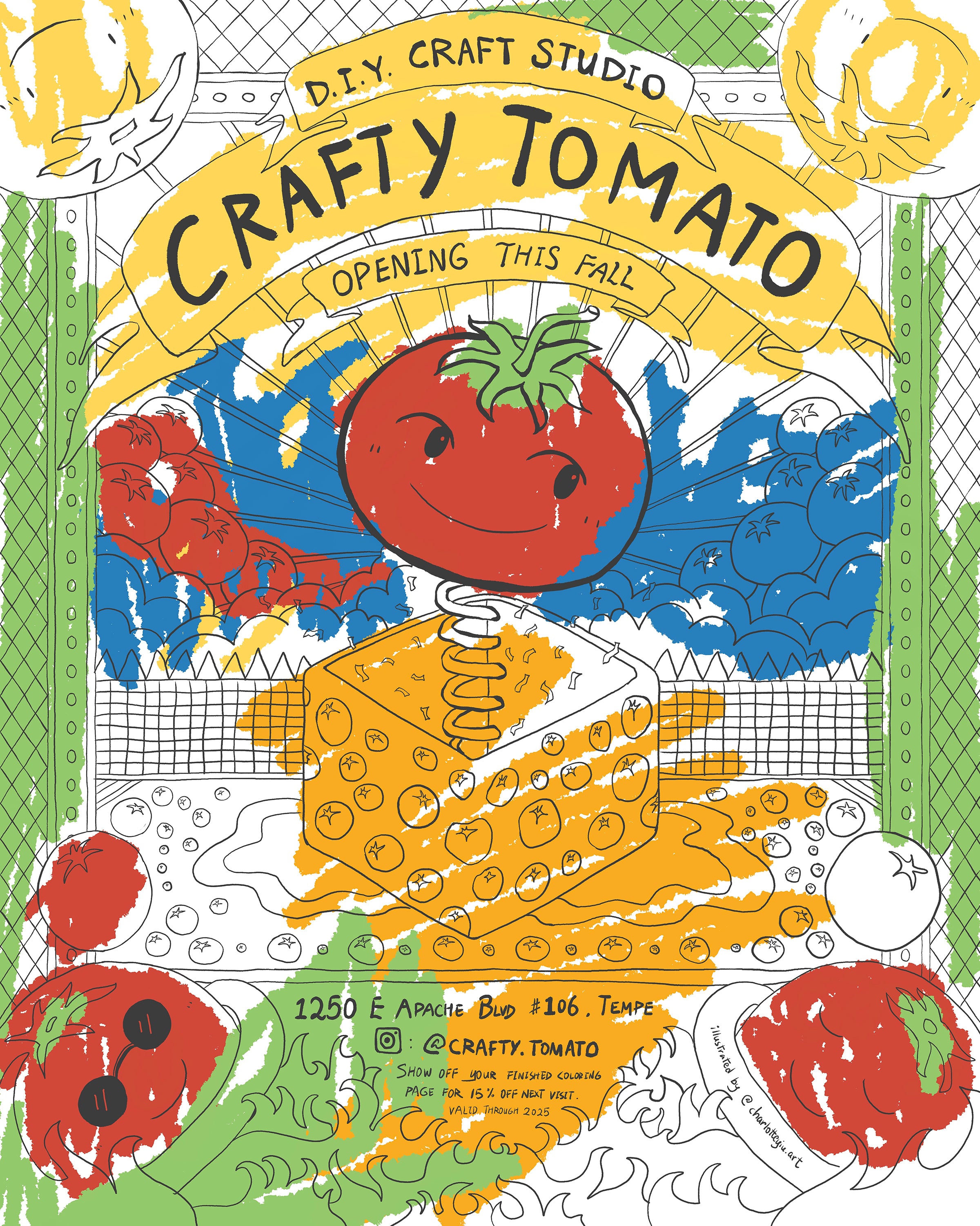 Sign up for our emails and we’ll send you a free Crafty Tomato coloring page to print at home. Want the fancy version? Follow us on Instagram @crafty.tomato to see where you can pick up a 110lb cardstock, beautifully printed edition in person. Finish your page, share it on your IG Stories, and tag us to get 15% off your next visit.