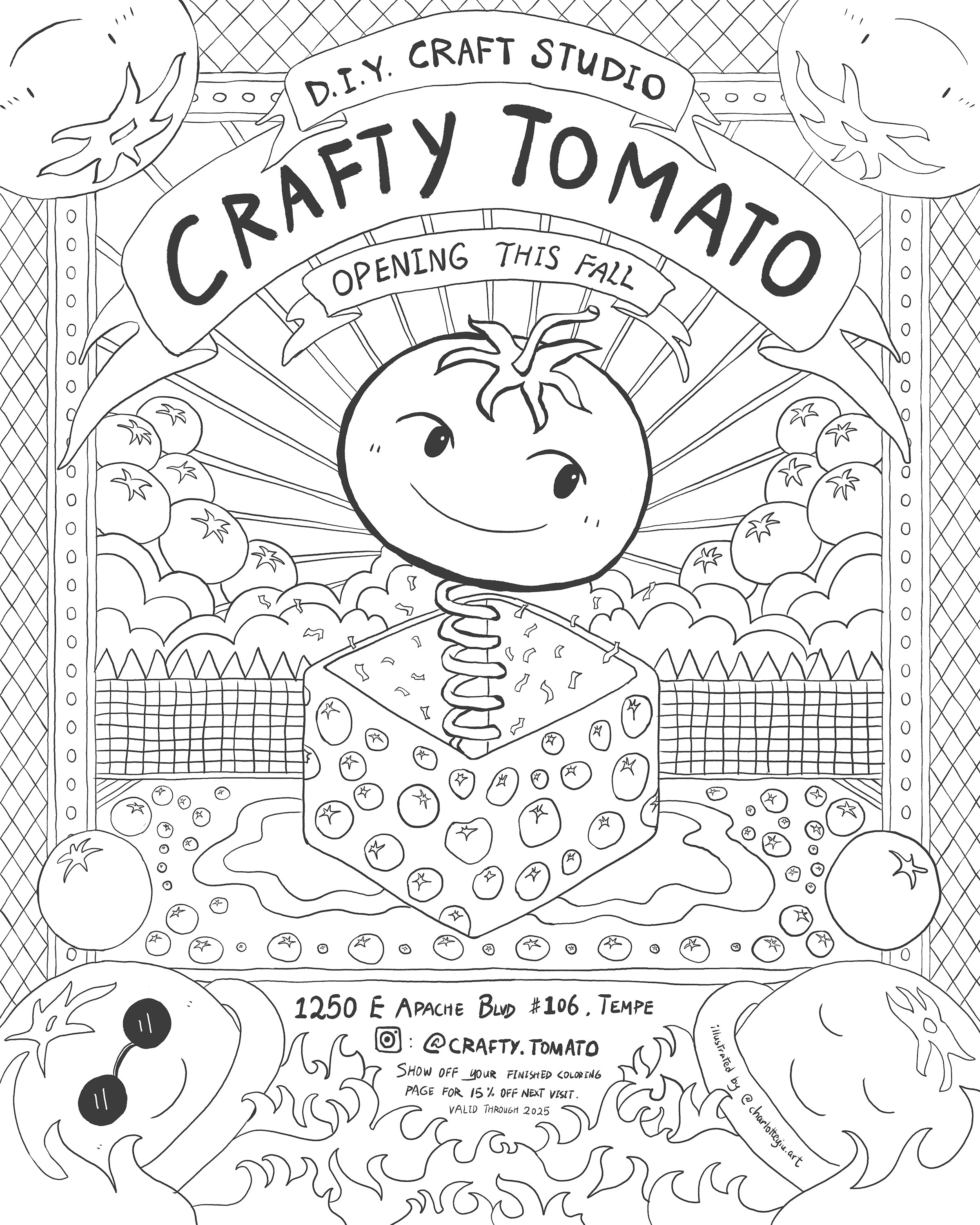 Sign up for our emails and we’ll send you a free Crafty Tomato coloring page to print at home. Want the fancy version? Follow us on Instagram @crafty.tomato to see where you can pick up a 110lb cardstock, beautifully printed edition in person. Finish your page, share it on your IG Stories, and tag us to get 15% off your next visit.